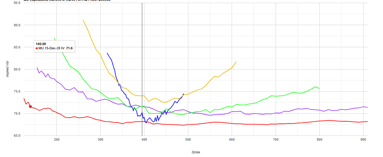 Above we see the IV of contracts ranging all the way to 15-Dec-28(very bottom line). IV is constantly near the 70 mark which is pretty high especially for a cyclical industry like MU is in so one downturn and the IV is coming down. Options for hedging would be a great idea here especially to pay the raised IV premium to protect you from a vicious downturn because the expected return is so high if it grows that premium will not hurt your gains that much. Puts at a comfortable selling price long dated would be ideal, in case this hype runs out you will at least be covered to some extent. Long strangles could also be a smart move as MU rarely trades flat giving you the ability to push your wings to maximize potential profit.