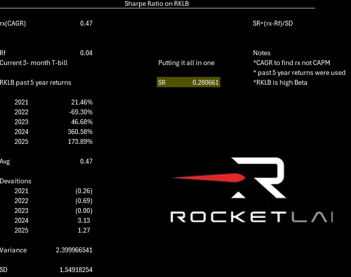 Now the part that's not as simple and that is the standard deviation or SD which is a common proxy for risk in the finance world. Finding the standard deviation sounds complicated but it is not let's take a look. Stock A has presented these returns over the past three years 10%,2%, and 14% so we take these and find the arithmetic average or geometric (depends on timeframe) which ends up being 8.67%. Next up we take all of our returns and figure out the amount deviated from the mean which basically means how far away did it move from average so the answers would be 1.33, -6.67, and 5.33 which I just did Yearly returns - mean. Now we square these deviations to work towards our variance so the answers would be 1.77, 44.49, and 28.41 all over n which is 3 (time). Variance equals 24.89 and now to get SD we simply take the square root of variance hints o2= variance and o= SD so we end up getting 4.99. 4.99 means that returns vary from the mean 4.99% of the time. Combining all of these together we get the Sharpe ratio and figure out what your return is for how much risk you are taking on. Let me show you the Sharpe ratio for Rocket Lab: RKLB. Assuming rx is found using CAGR (Compound Annual Growth Rate) maybe another day it will get an article but, lets focus on Sharpe right now LOL.
