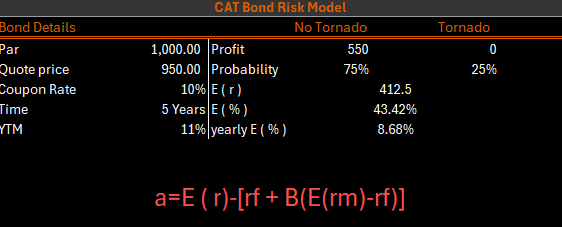 Portfolios are usually at risk for one big thing and that is systematic risk which can destroy the whole market essentially. Portfolios consisting of mainly equities will not be " Diversified" from market risk in a net positive way usually. As of the time I am writing this we are in full swing of market risk with the Iran situation and repricing from the SAASpocalypse which has most likely brought your portfolio into the red not unless you had short exposure. Market risk can be somewhat avoided by finding uncorrelated returns such as CAT bonds to generate alpha and avoid market risk but rather take on event risk. Diversifying risk is a smart idea, if possible, such as having some of your portfolio exposed to market risk or event risk. Before we get into CAT bonds, I think the term alpha should be looked at in depth. Alpha or α=Ri−[Rf+β(Rm−Rf)], basically actual - expected return. Alpha is how much you beat a benchmark by. Example Stock ABC performs with a solid 10% gain actively in which the CAPM (go to Sharpe ratio paper) model expected a 7% return on the stock we can assume a 3% alpha. Now that we get the idea of alpha let's talk about the center point of this article and that is this weird investment tool being CAT bonds. Debt has this relationship with time being the longer the riskier with all else equal a 30-year bond will be riskier than a 1-year bond. Basic debt knowledge will not be covered here as CAT bonds differ pretty heavy than your Gov, Muni, and corporate bonds. CAT bonds are bonds issued by insurance companies (3-5 years) to help raise capital and transfer risk to investors in which the investor takes on event risk. Event risk on a CAT would be an insurance company worried about a tornado coming through, so they issue CATs to raise capital in case of the emergency. Events with a high probability will bring out bonds with higher yields (Traded at discount so yield is higher) in which the investor can buy the bond and receive interest/coupons. Two things can happen here with the tornado example let's see both. Option 1 the tornado does not come through so the investor would make all the interest plus the face value difference (assuming discount) and will walk away safe while essentially selling insurance for the tornado. Option 2 the tornado comes through and wrecks the town meaning the investor has now lost his investment as this money will now go towards the disaster instead of the investor.
