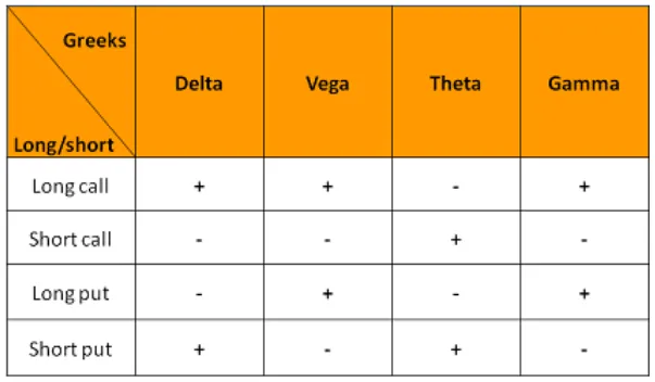 Above is a chart that implies the values for the Greeks listed and how they are measured per each type of option. Signs in front of the respected Greek will show you how they move when the underlying moves that are related to the underlying (Delta and Gamma) and Greeks related to extrinsic factors (Theta and Vega) will move when their respected factor changes. Greeks are just mathematical sensitivities that state current market traits so it is important to not just rely on these, Extrinsic events are always a possibility, and the Greeks cannot price that in so acknowledge them but do not rely on them fully for your trade.